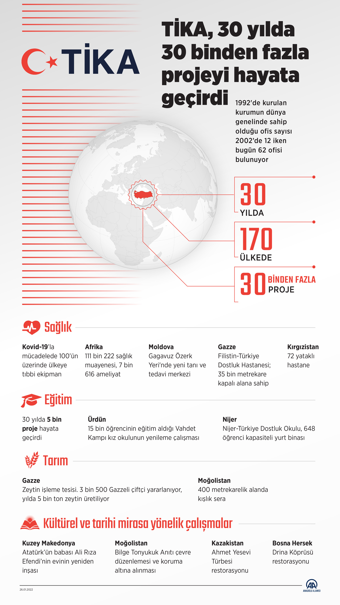 Kuruluşunun üzerinden 30 yıl geçen Türk İşbirliği ve Koordinasyon Ajansı Başkanlığı (TİKA), bu sürede 170 ülkede eğitimden tarıma, temiz suya erişimden restorasyona 30 binden fazla proje gerçekleştirdi. ( Elmurod Usubaliev - Anadolu Ajansı )26 Ocak 2022•Güncelleme: 26 Ocak 2022