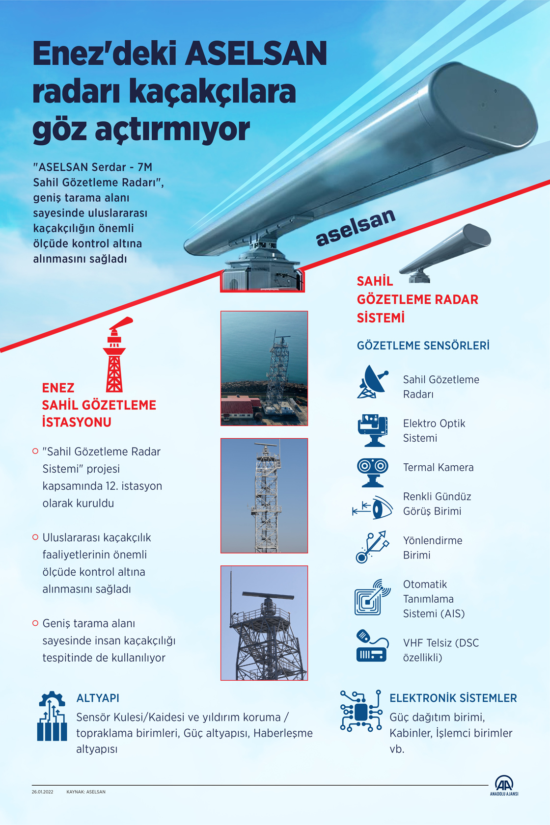 "ASELSAN Serdar - 7M Sahil Gözetleme Radarı", geniş tarama alanı sayesinde uluslararası kaçakçılığın önemli ölçüde kontrol altına alınmasını sağladı. (Muhammed Ali Yiğit - AA)