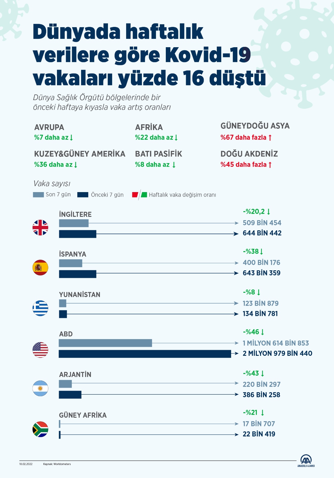 Kovid-19'un Omicron varyantı dünyada etkisini sürdürürken haftalık küresel vaka artışlarında bir önceki haftaya göre yüzde 16 oranında düşüş, ölümlerde ise yüzde 7 artış görüldü.