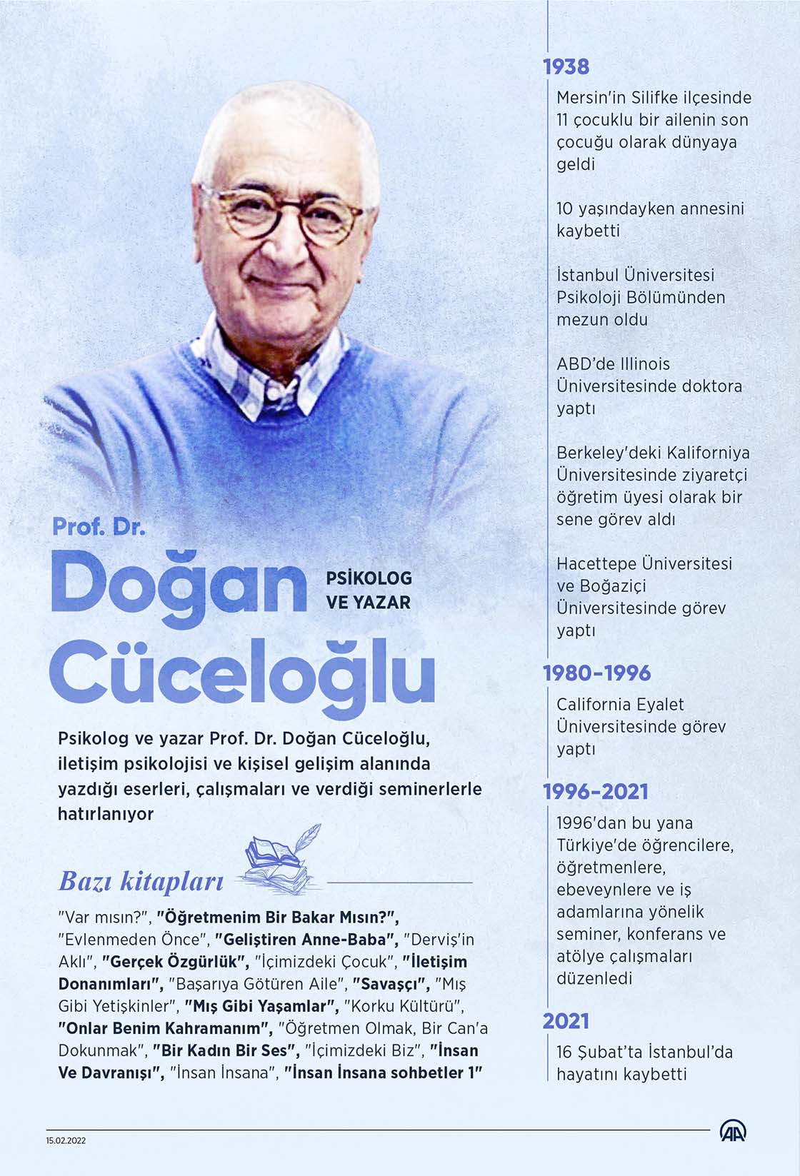 Psikolog ve yazar Prof. Dr. Doğan Cüceloğlu, iletişim psikolojisi ve kişisel gelişim alanında yazdığı eserleri, çalışmaları ve verdiği seminerlerle hatırlanıyor.(Grafik: Muhammed Ali Yiğit / AA)