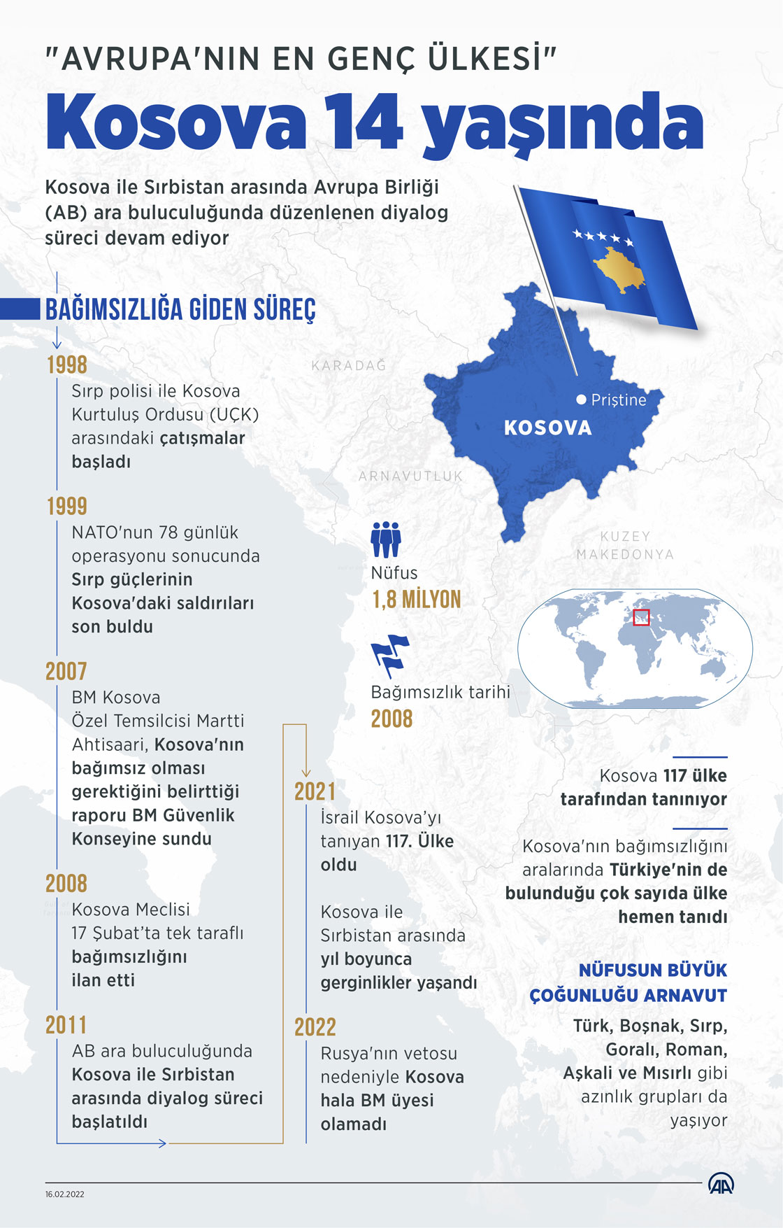 Sırbistan'dan ayrılarak 17 Şubat 2008'de tek taraflı bağımsızlığını ilan eden "Avrupa’nın en genç ülkesi" Kosova, 14’üncü yaşını kutluyor. (Grafik: Yasin Demirci / AA)