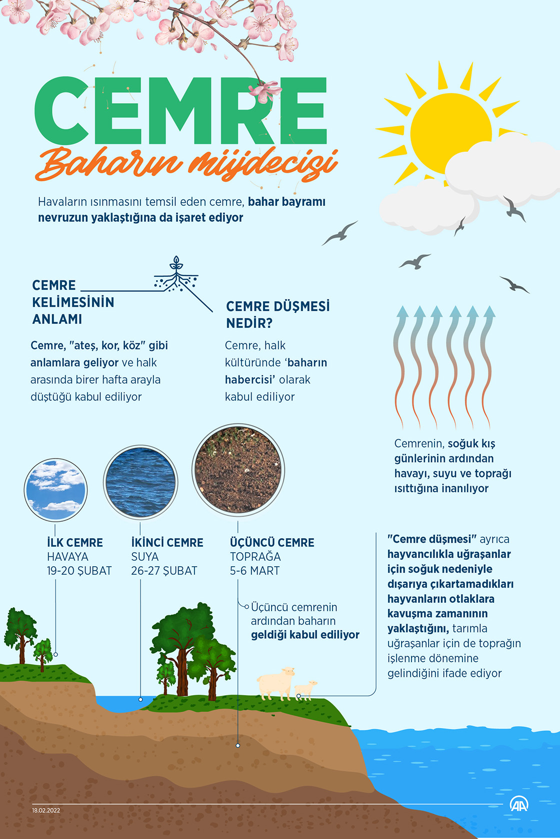 "Ateş", "kor", "köz" gibi anlamları olan ve halk arasında birer hafta arayla düştüğü kabul edilen cemrenin, soğuk kış günlerinin ardından havayı, suyu ve toprağı ısıttığına inanılıyor. (Grafik: Omar Zaghloul)