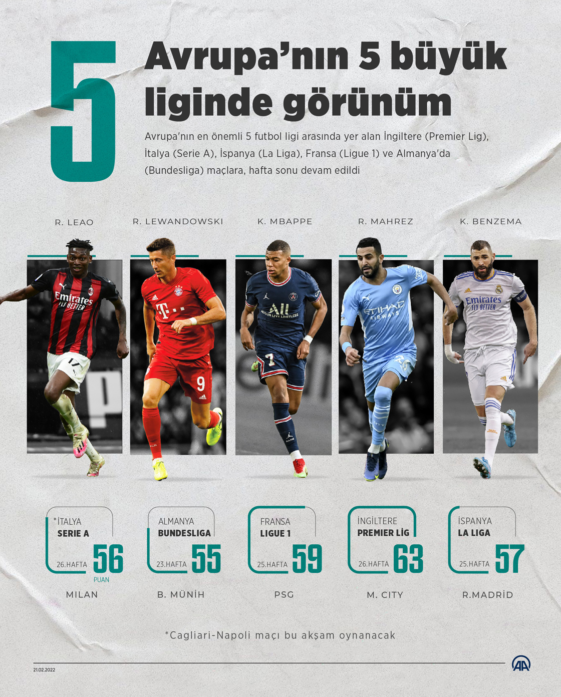 Avrupa'nın en büyük 5 futbol ligi kabul edilen İngiltere (Premier Lig), İspanya (La Liga), İtalya (Serie A), Almanya (Bundesliga) ve Fransa'daki (Ligue 1) maçlara, hafta sonu devam edildi.(Grafik: Kemal Delikmen/AA)