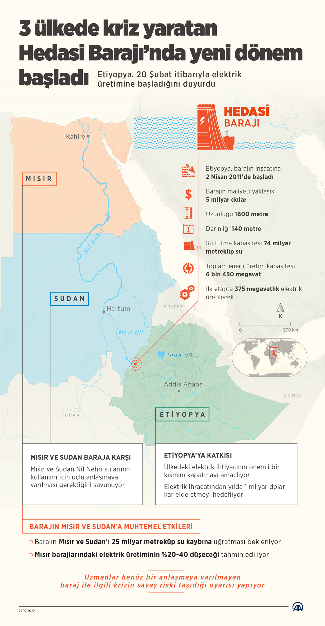 Etiyopya hükümetinin, Nil Nehri suları üzerinde inşa ettiği Büyük Rönesans Barajı'nda (Hedasi) elektrik üretimine resmen başlaması, Mısır ve Sudan ile devam eden krizde yeni bir aşamaya geçilmesine neden oldu.(Grafik: Muhammed Ali Yiğit/AA)