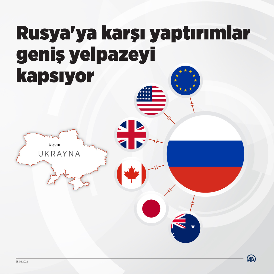 Rusya'nın Ukrayna'ya askeri müdahalesinin ardından başta Avrupa Birliği (AB) ve ABD olmak üzere çok sayıda ülkenin, finans, enerji, ulaşım ve ticaret alanlarını kapsayan geniş yelpazede ekonomik yaptırımlar uygulamaya koyması dikkati çekiyor. (Grafik: Elmurod Usubaliev / AA)25 Şubat 2022•Güncelleme: 25 Şubat 2022