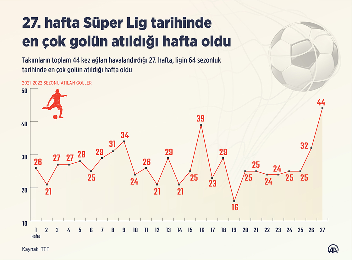 Süper Lig'in 64 sezonluk tarihinde en çok golün kaydedildiği hafta geride kaldı. Ligin 27. haftasında oynanan 10 müsabakada takımlar toplam 44 kez fileleri havalandırdı. (Grafik: Mahmut Resul Karaca/AA)