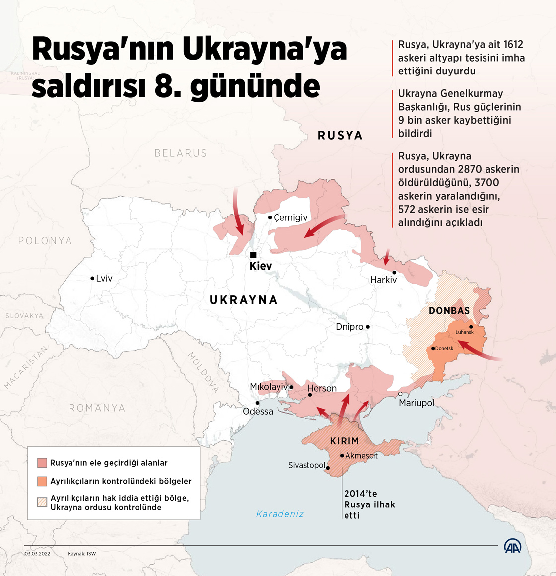 Rusya, Ukrayna'ya ait 1612 askeri altyapı tesisini imha ettiğini duyurdu. Ukrayna Genelkurmay Başkanlığı, Rus güçlerinin 9 bin asker kaybettiğini bildirdi. (Grafik: Elmurod Usubaliev/AA)