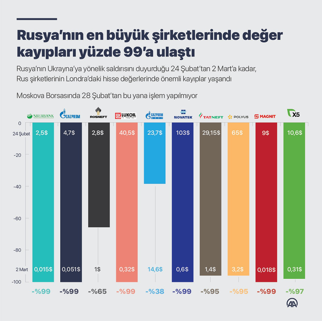 Rus ekonomisinde önemli yere sahip Sberbank ve Gazprom gibi şirketlerin hisse değerleri Ukrayna ile savaşın başlamasından bu yana yüzde 99 değer kaybederek adeta buharlaştı. ( Mahmut Resul Karaca - Anadolu Ajansı )