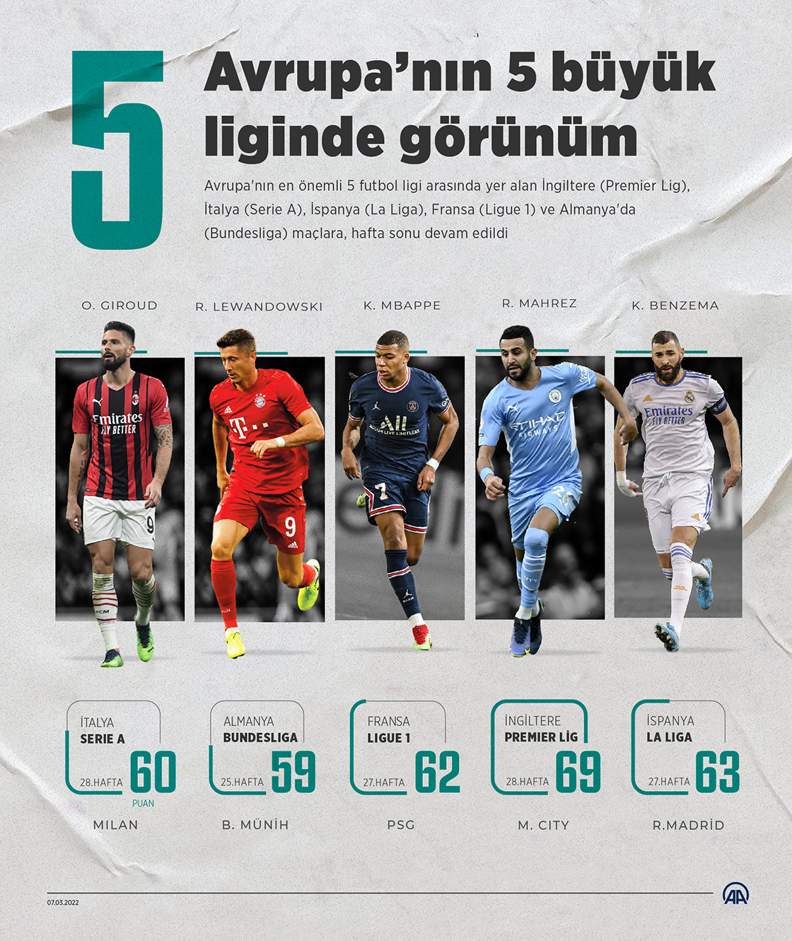 Avrupa'nın en büyük 5 futbol ligi kabul edilen İngiltere (Premier Lig), İspanya (La Liga), İtalya (Serie A), Almanya (Bundesliga) ve Fransa'daki (Ligue 1) maçlara, hafta sonu devam edildi. ( Kemal Delikmen - Anadolu Ajansı )