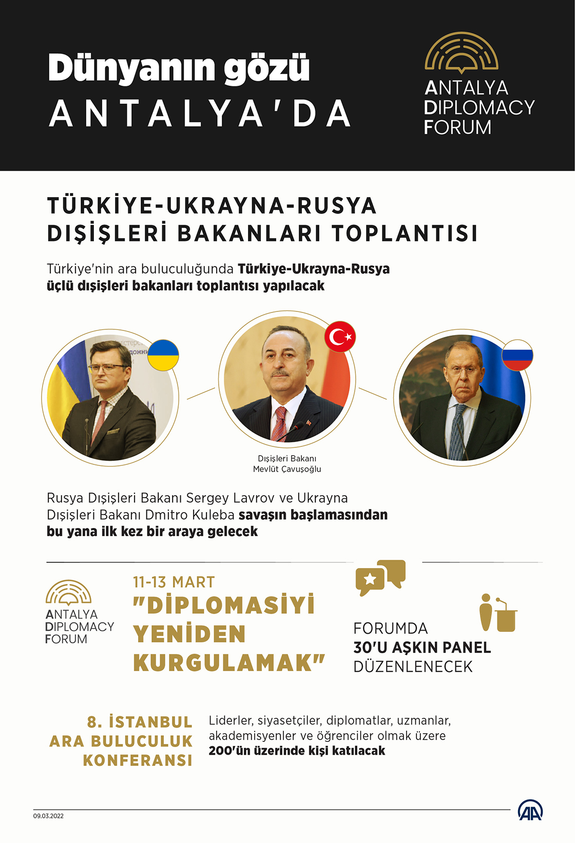 Dünya, Türkiye'nin ara buluculuğu ile yarın Antalya Diplomasi Forumu (ADF) marjında Antalya'da yapılacak Rusya-Ukrayna-Türkiye üçlü dışişleri bakanları toplantısını bekliyor. (Grafik: Mahmut Resul Karaca/AA)