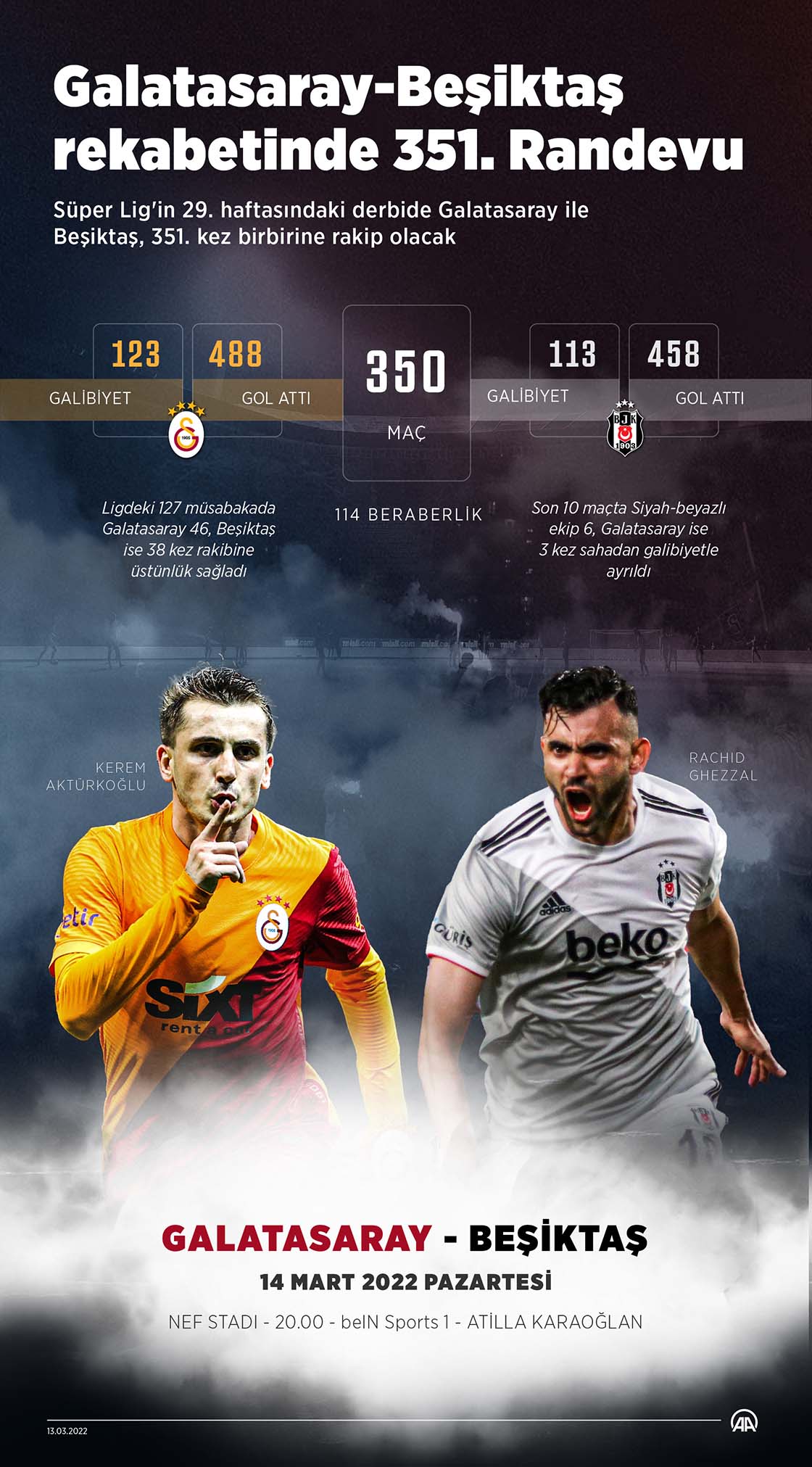 Süper Lig'in 29. haftasındaki derbide yarın karşılaşacak Galatasaray ile Beşiktaş, tarihlerinde 351. kez birbirine rakip olacak. (Grafik: Muhammed Ali Yiğit/ AA)