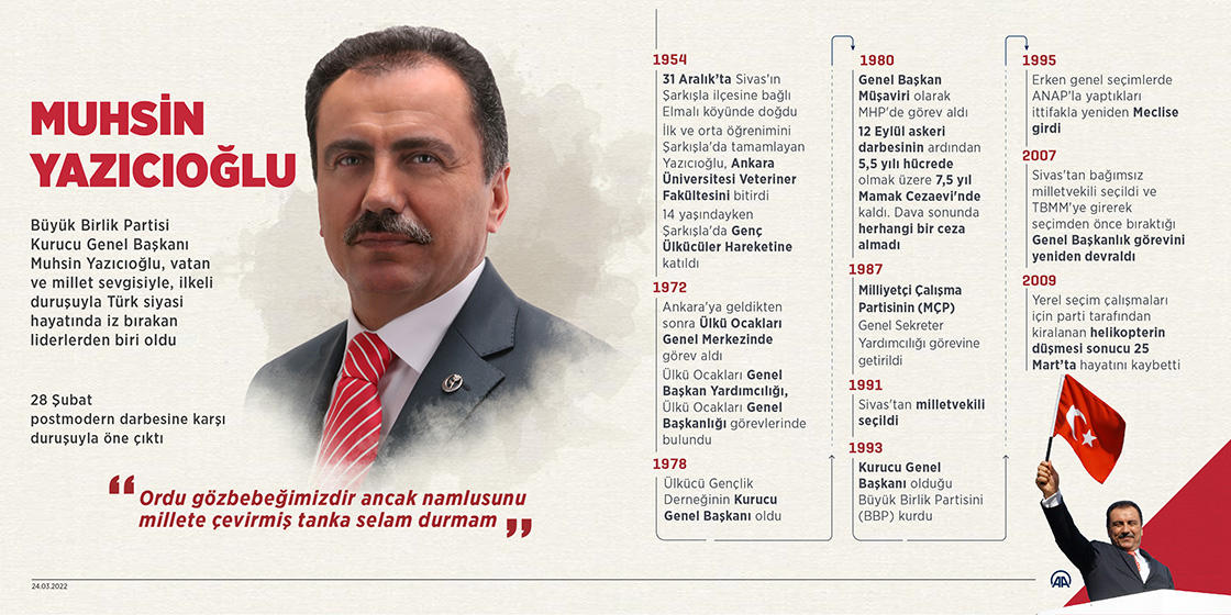 Büyük Birlik Partisi Kurucu Genel Başkanı Muhsin Yazıcıoğlu, vatan ve millet sevgisiyle, ilkeli duruşuyla Türk siyasi hayatında iz bırakan liderlerden biri oldu.