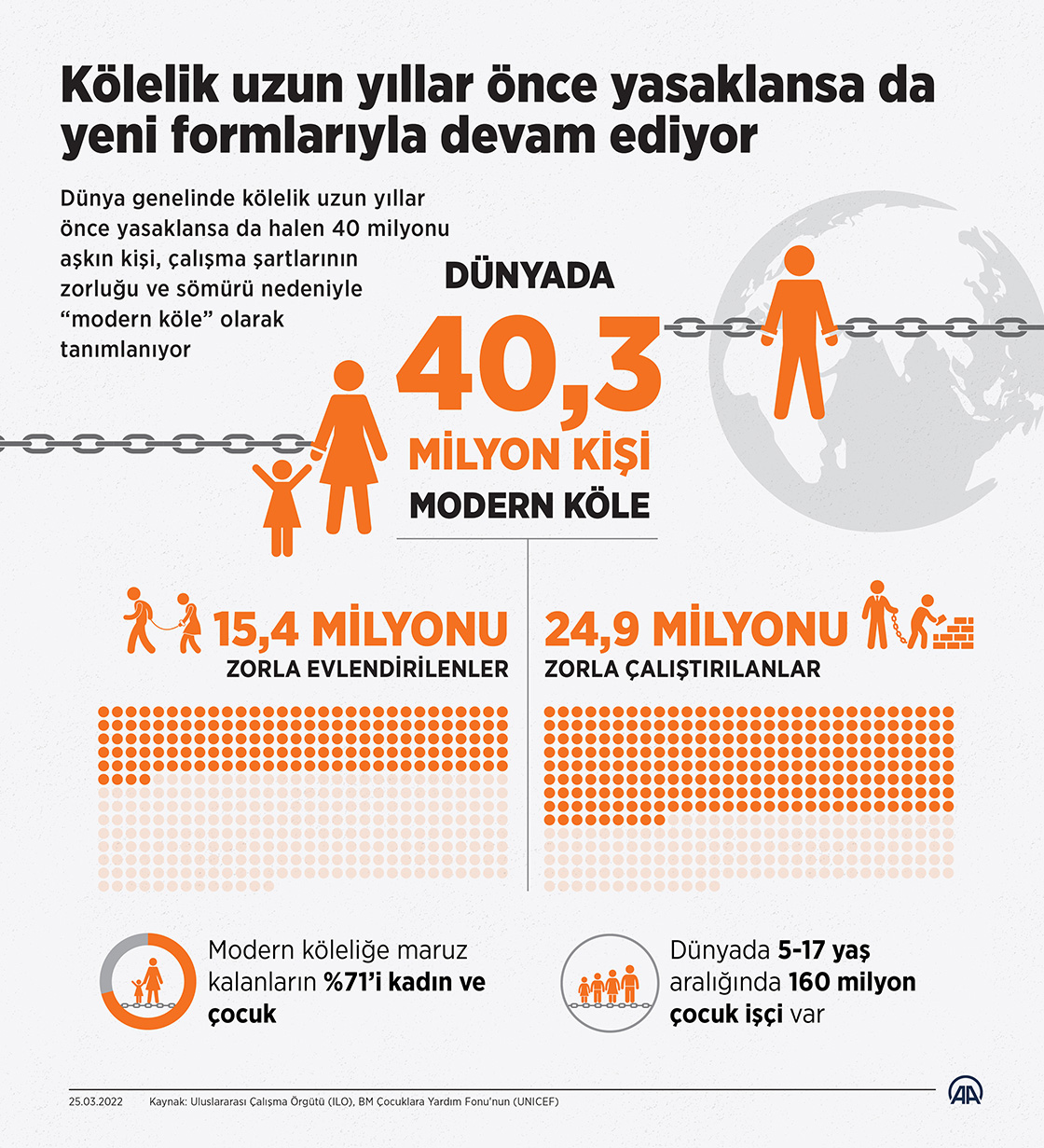 Dünya genelinde kölelik uzun yıllar önce yasaklansa da halen 40 milyonu aşkın kişi, çalışma şartlarının zorluğu ve sömürü nedeniyle "modern köle" olarak tanımlanıyor. (Grafik: Elmurod Usubaliev/AA)
