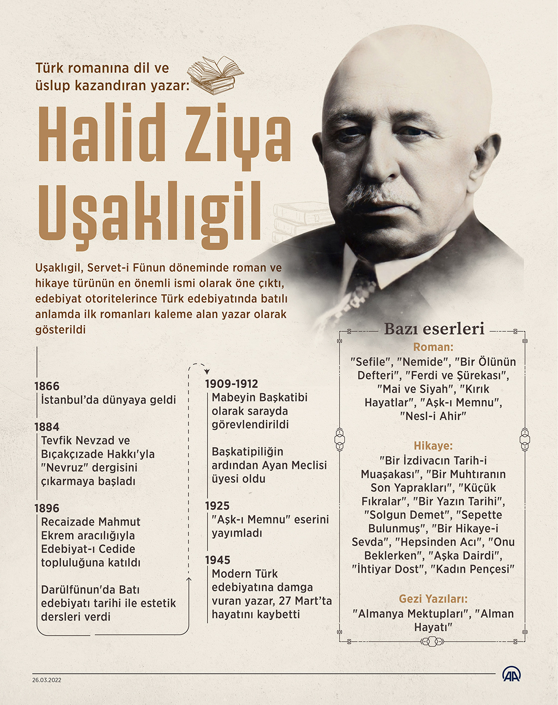Uşaklıgil, Servet-i Fünun döneminde roman ve hikaye türünün en önemli ismi olarak öne çıktı, edebiyat otoritelerince Türk edebiyatında batılı anlamda ilk romanları kaleme alan yazar olarak gösterildi. ( Omar Zaghloul - Anadolu Ajansı )26 Mart 2022•Güncelleme: 26 Mart 2022