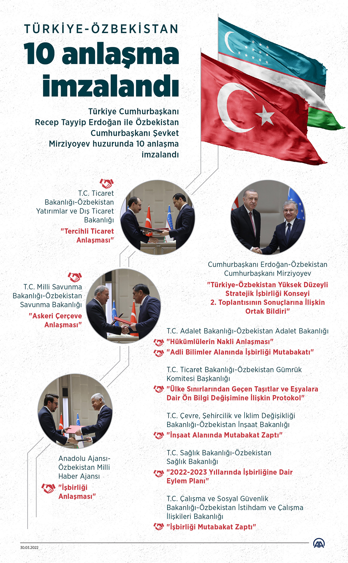 Türkiye Cumhurbaşkanı Recep Tayyip Erdoğan ile Özbekistan Cumhurbaşkanı Şevket Mirziyoyev huzurunda 10 anlaşma imzalandı.
