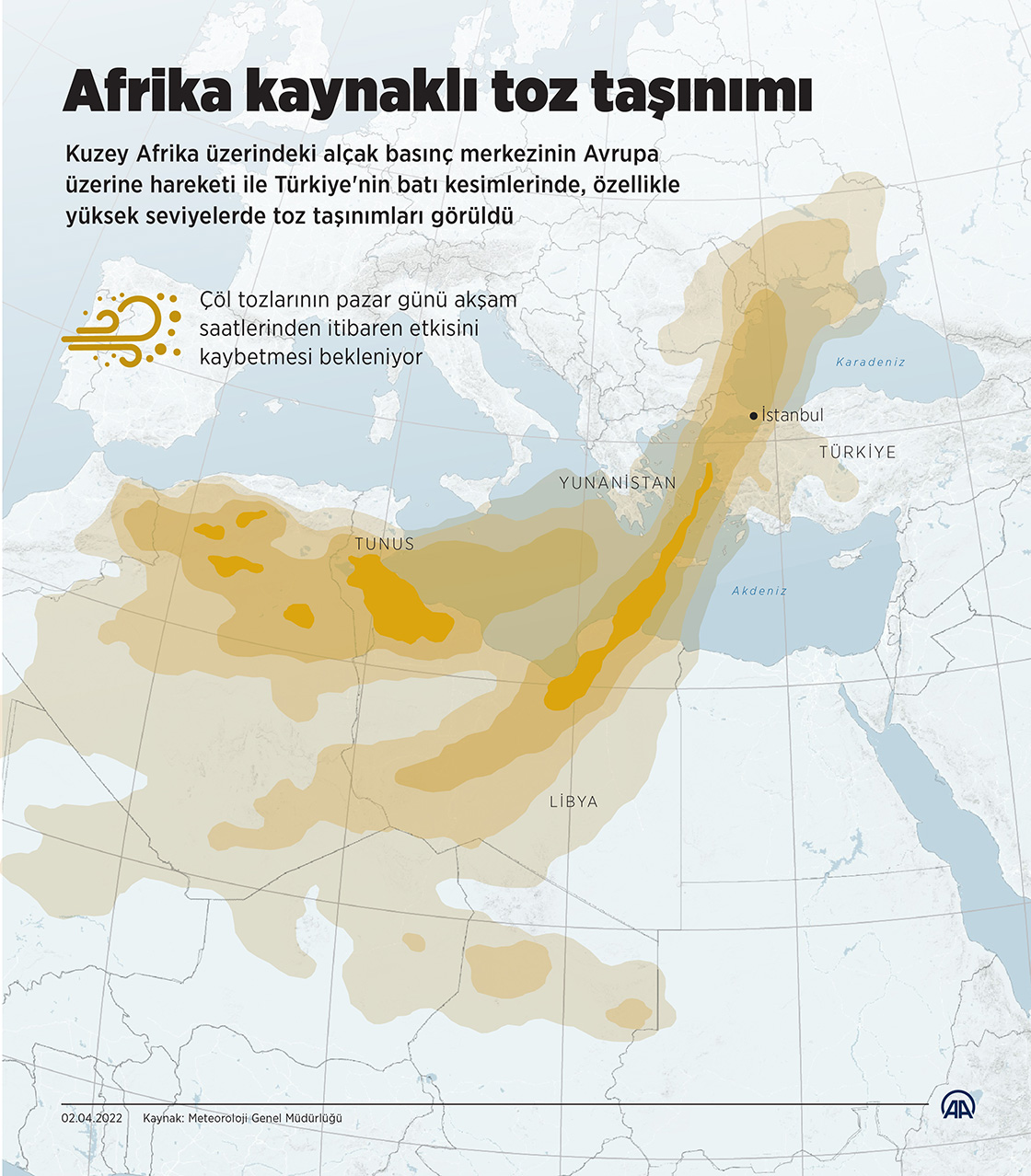 Kuzey Afrika üzerindeki alçak basınç merkezinin Avrupa üzerine hareketi ile Türkiye'nin batı kesimlerinde, özellikle yüksek seviyelerde toz taşınımları görüldü.