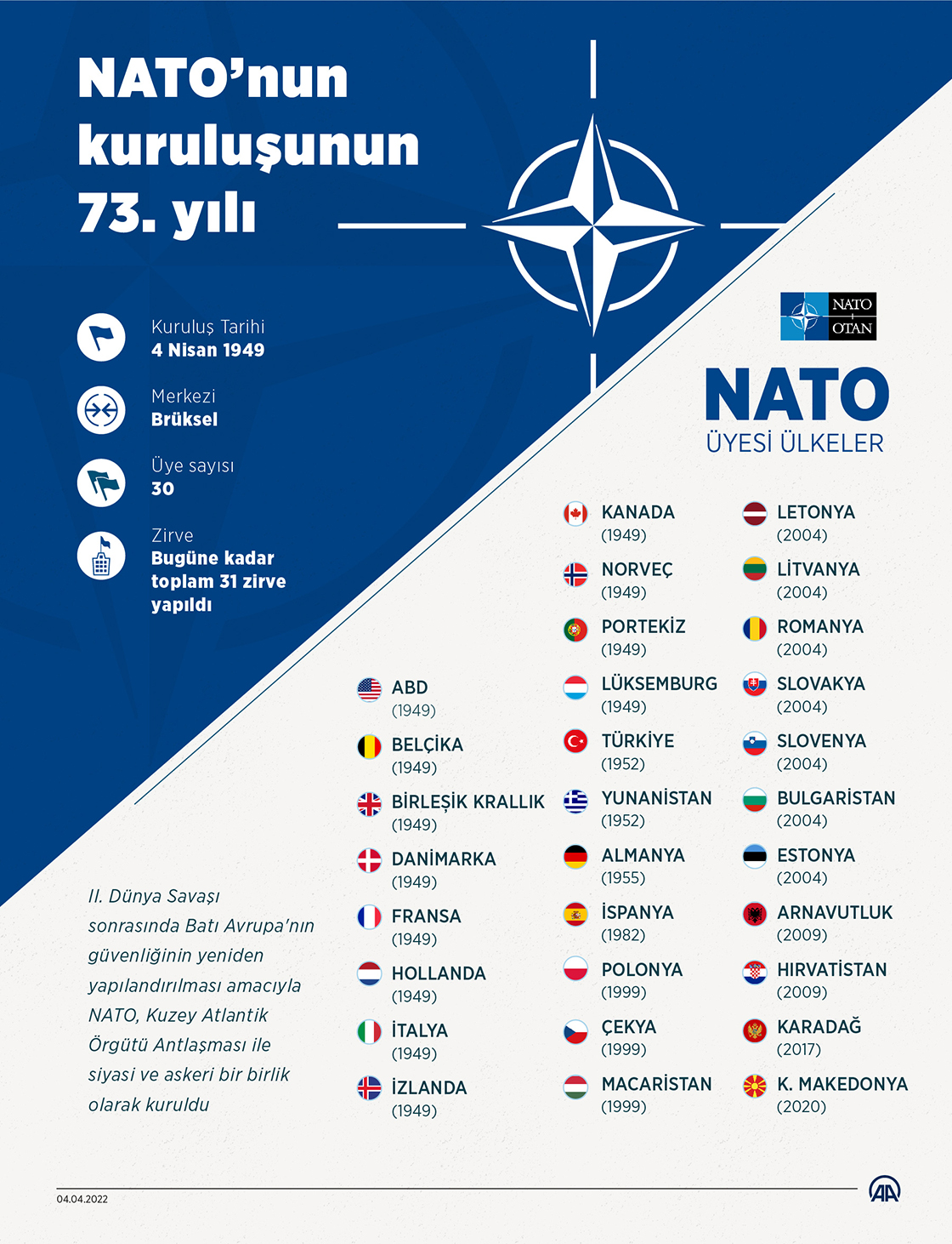 NATO, kuruluşunun 73. yılında "Soğuk Savaş'tan bu yana Avrupa'nın karşılaştığı en büyük tehdit", "İkinci Dünya Savaşı'ndan sonra gördüğü en büyük yıkım" olarak nitelendirilen Rusya-Ukrayna savaşının etkisiyle kıtanın güvenliğinde daha kritik rol oynuyor. (Grafik: Kemal Delikmen/AA)