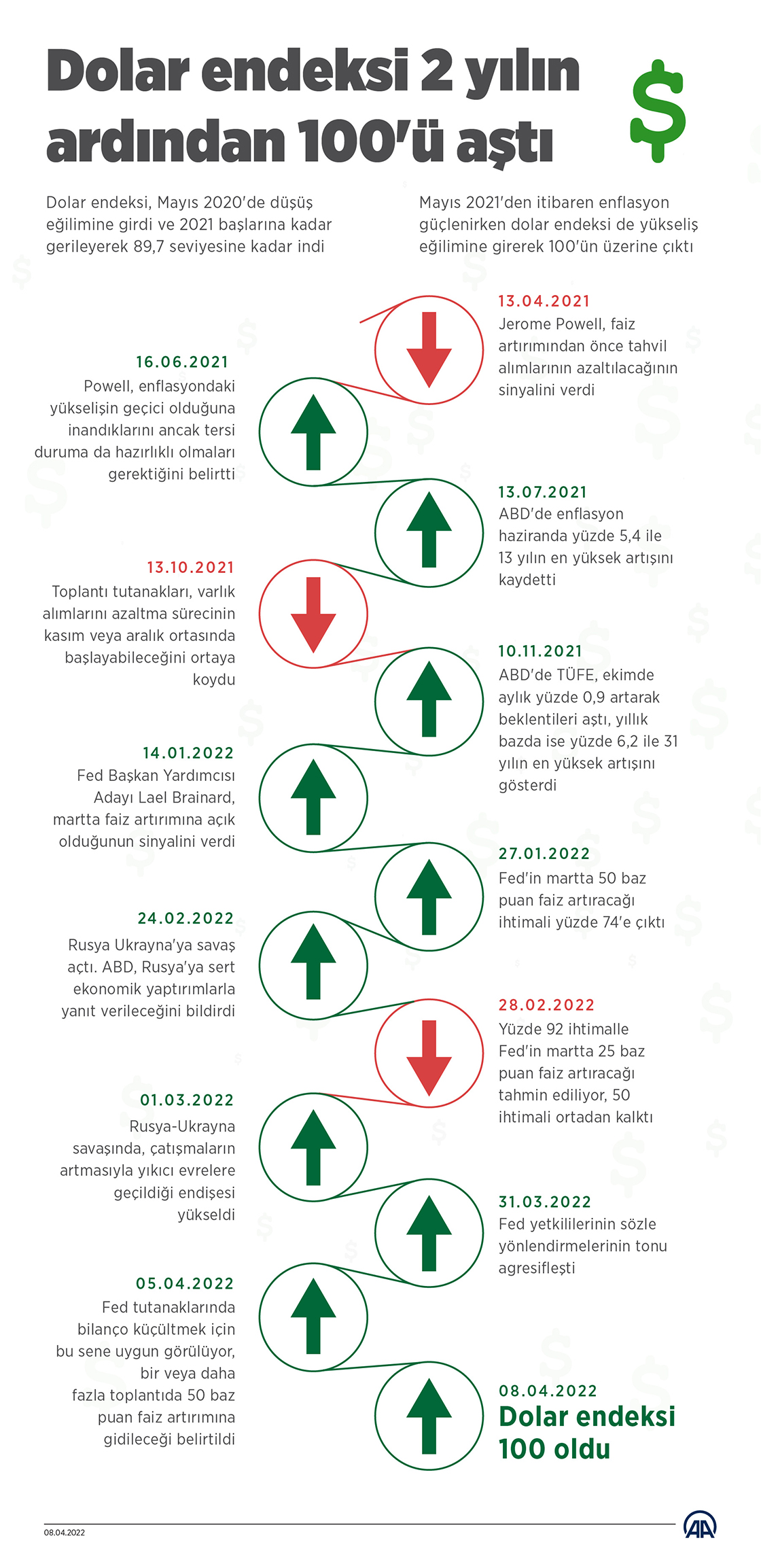 Fed'in Kovid-19 salgınıyla birlikte ekonomik sıkıntıları hafifletmek amacıyla uygulamaya aldığı genişleyici politikalarla 2021'de 90'a kadar gerileyen dolar endeksi, bankanın şahinleşmesiyle birlikte yaklaşık iki yıl sonra tekrar 100'ün üzerine çıktı.