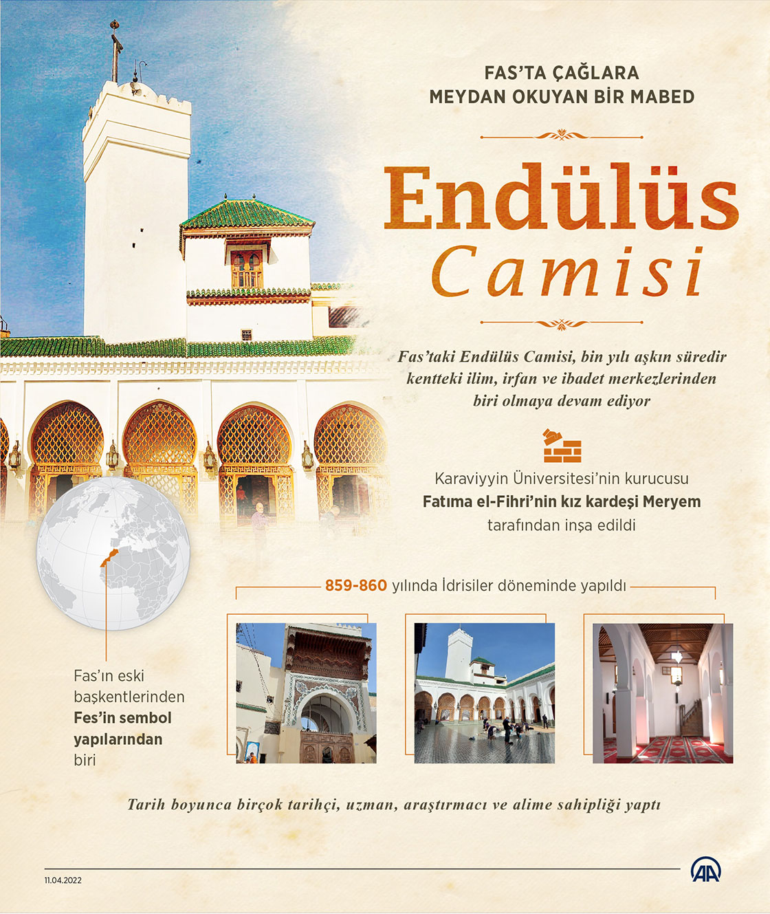 İslam tarihinde önemli bir yere sahip olan Endülüs Emevi Devleti’nin kültürel etkileşiminin ana üssü olan Fas’ın dört bir tarafında eserler yükselirken, Fes kentinin simgelerinden olan Endülüs Camisi de bin yılı aşkındır kentteki iki ilim, irfan ve ibadet merkezlerinden biri olmaya devam ediyor. ( Muhammed Ali Yiğit - Anadolu Ajansı )11 Nisan 2022•Güncelleme: 11 Nisan 2022