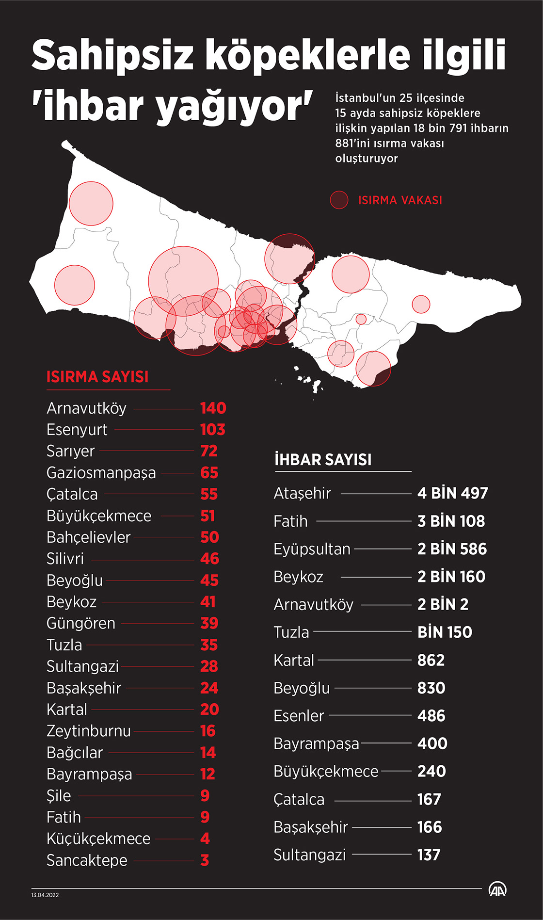 İstanbul'un 25 ilçesinde 15 ayda sahipsiz köpeklere ilişkin yapılan 18 bin 791 ihbarın 881'ini ısırma vakası oluşturuyor. (Grafik: Mahmut Resul Karaca/AA)