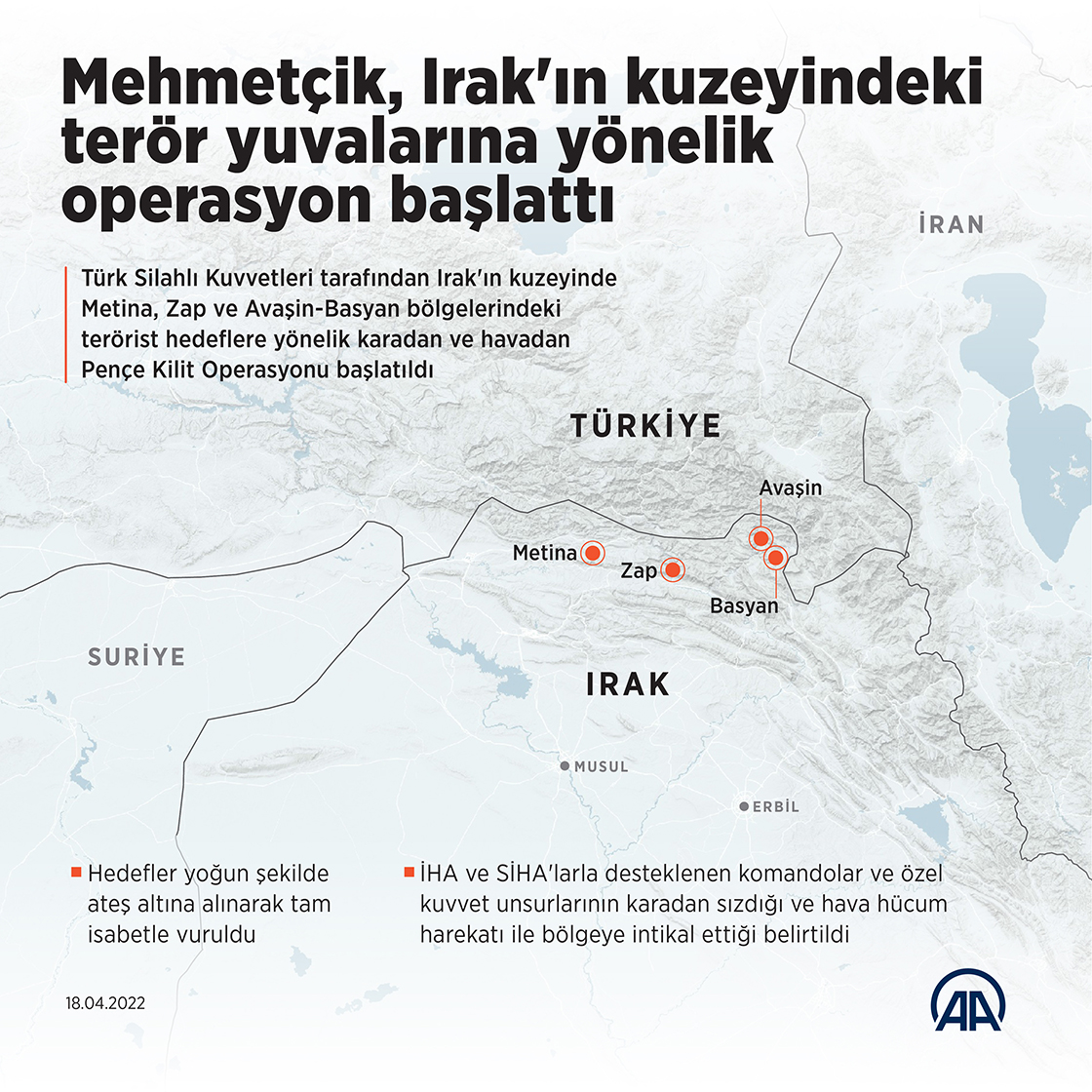 Türk Silahlı Kuvvetleri tarafından Irak'ın kuzeyinde Metina, Zap ve Avaşin-Basyan bölgelerindeki terörist hedeflere yönelik karadan ve havadan Pençe Kilit Operasyonu başlatıldı.(Grafik: Elmurod Usubaliev/AA)