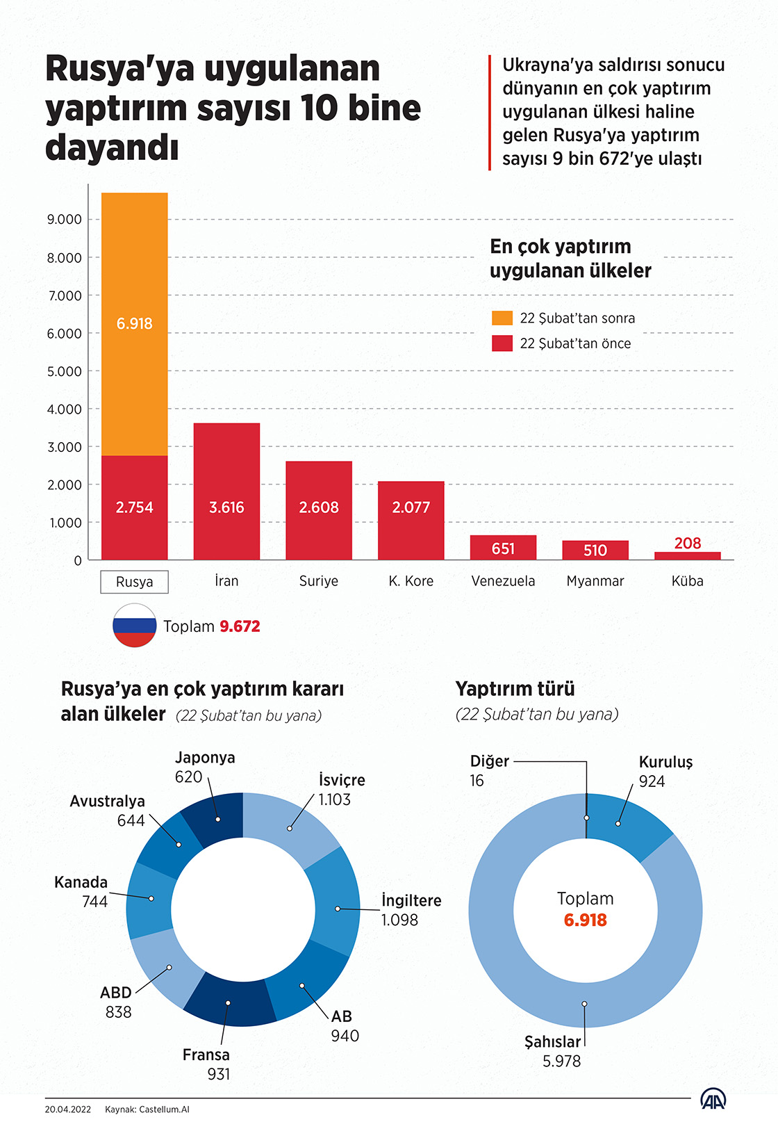 Ukrayna'ya saldırısı sonucu dünyanın en çok yaptırım uygulanan ülkesi haline gelen Rusya'ya yaptırım sayısı 9 bin 672'ye ulaştı. (Grafik: Elmurod Usubaliev/AA)