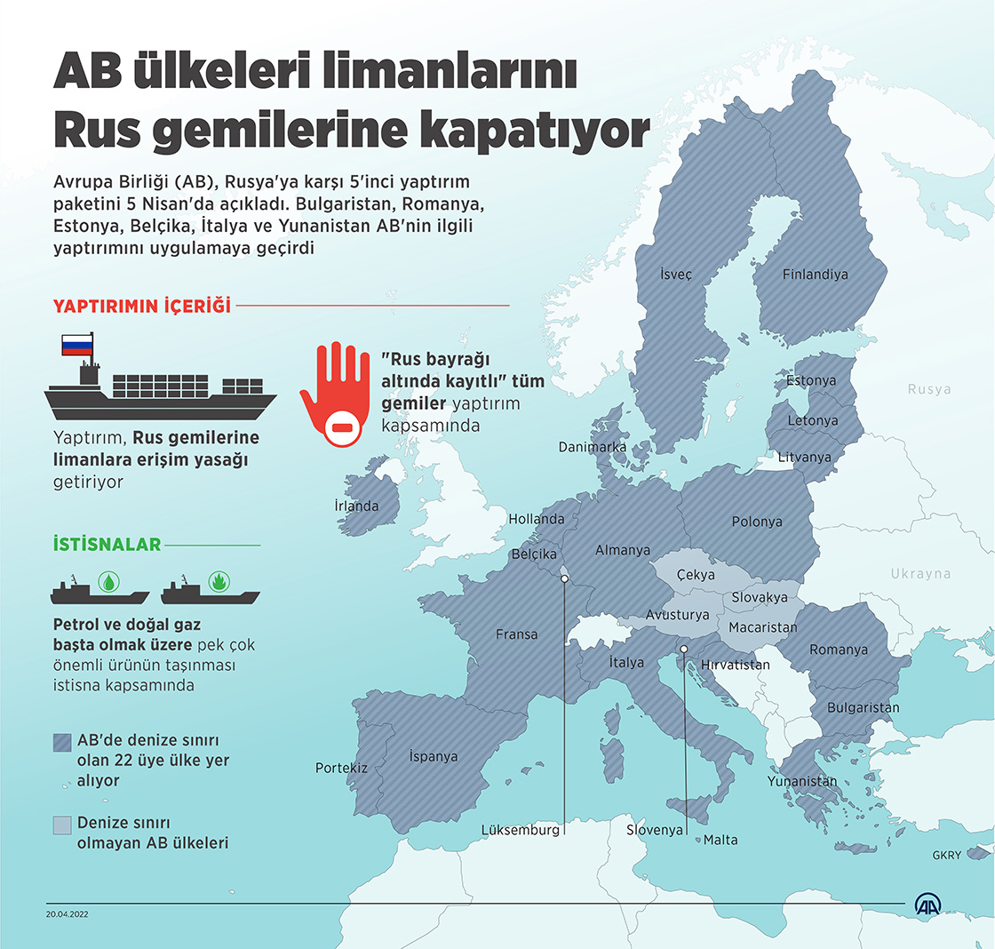 Avrupa Birliği (AB) ülkeleri Rus gemilerine limanlara erişim yasağını peş peşe uygulamaya başlarken petrol ve doğal gaz başta olmak üzere pek çok önemli ürünün taşınması istisna kapsamında tutuluyor. (Grafik: Yasin Demirci/AA)