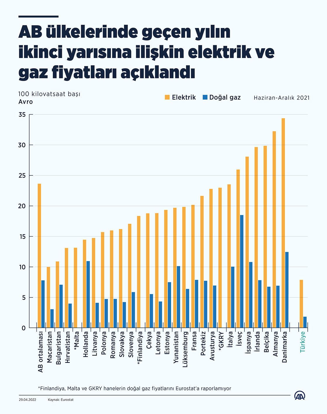 Avrupa Birliği (AB) ülkelerinde geçen yılın ikinci yarısında konutlarda 100 kilovatsaat elektrik için ödenen tutar ortalama 23,7 avroya çıktı. Bu rakam önceki yılın aynı döneminde 21,3 avro seviyesinde gerçekleşmişti.29 Nisan 2022•Güncelleme: 29 Nisan 2022