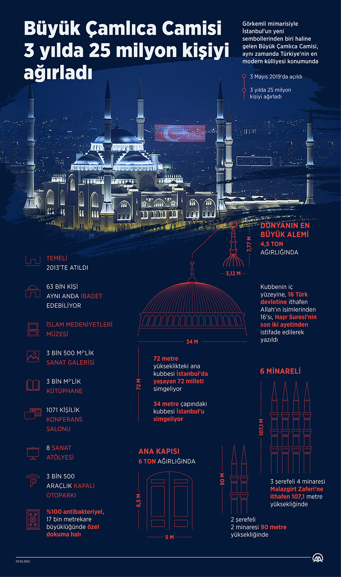 Görkemli mimarisiyle İstanbul'un yeni sembollerinden biri haline gelen, aynı zamanda Türkiye'nin en modern külliyesi olan asrın mührü Büyük Çamlıca Camisi'nin açılışının üzerinden üç yıl geçti. (Grafik: Yılmaz Yücel/AA)
