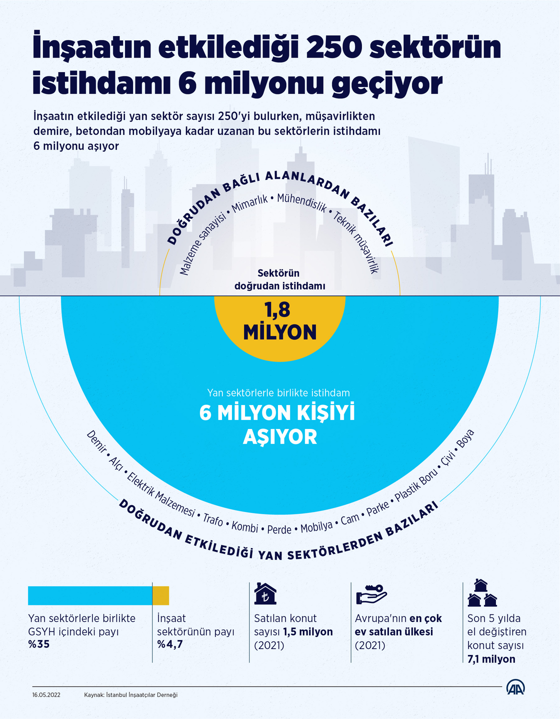 İnşaatın etkilediği yan sektör sayısı 250'yi bulurken, müşavirlikten demire, betondan mobilyaya kadar uzanan bu sektörlerin istihdamı 6 milyonu aşıyor. ( Yasin Demirci - Anadolu Ajansı )