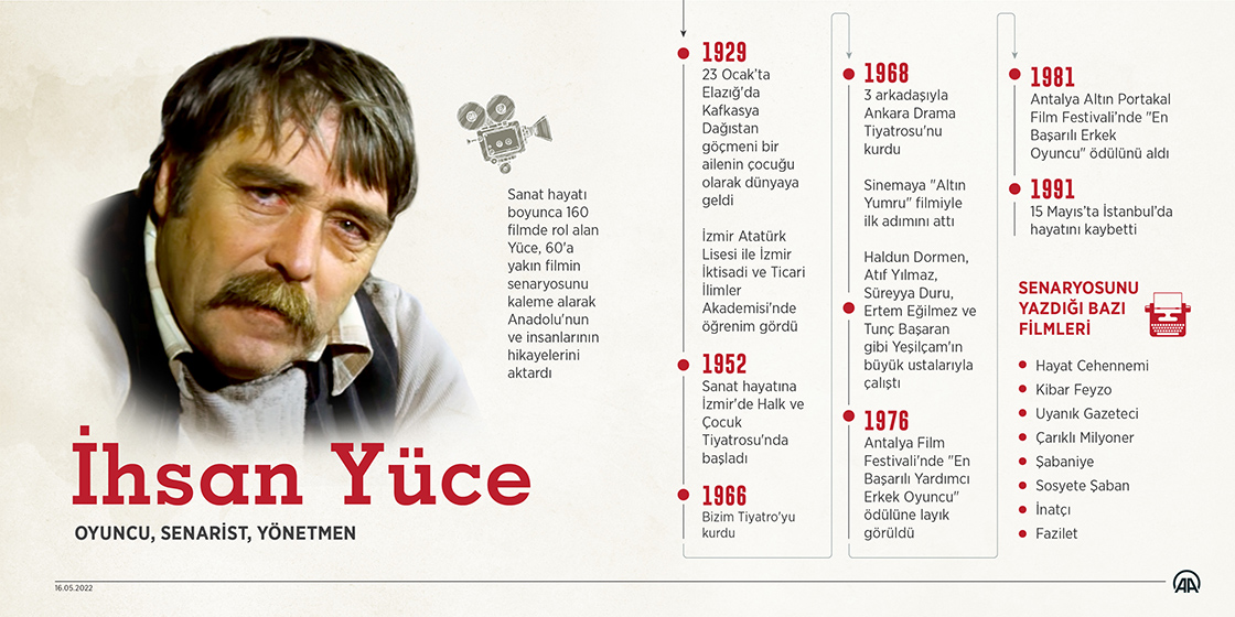Sanat hayatı boyunca 160 filmde rol alan Yüce, 60'a yakın filmin senaryosunu kaleme alarak Anadolu'nun ve insanlarının hikayelerini aktardı. ( Mahmut Resul Karaca - Anadolu Ajansı )