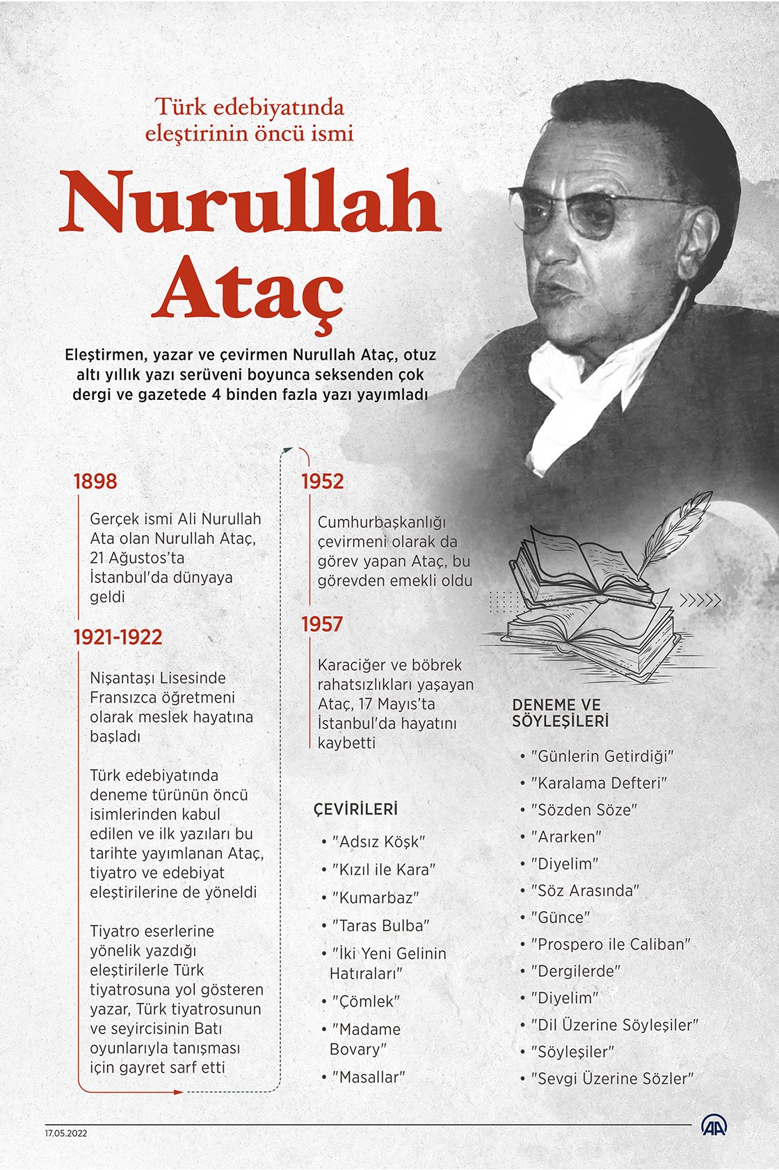 Türk edebiyatında deneme türünün öncü isimlerinden kabul edilen eleştirmen, yazar ve çevirmen Nurullah Ataç, otuz altı yıllık yazı serüveni boyunca seksenden çok dergi ve gazetede 4 binden fazla yazı yayımladı.
