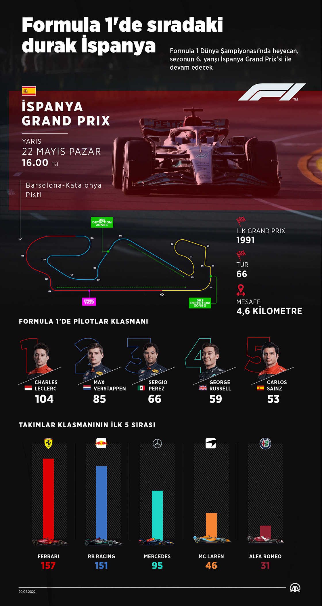 Formula 1 Dünya Şampiyonası'nda heyecan, sezonun 6. yarışı İspanya Grand Prix'si ile devam edecek. (Grafik: Kemal Delikmen/AA)