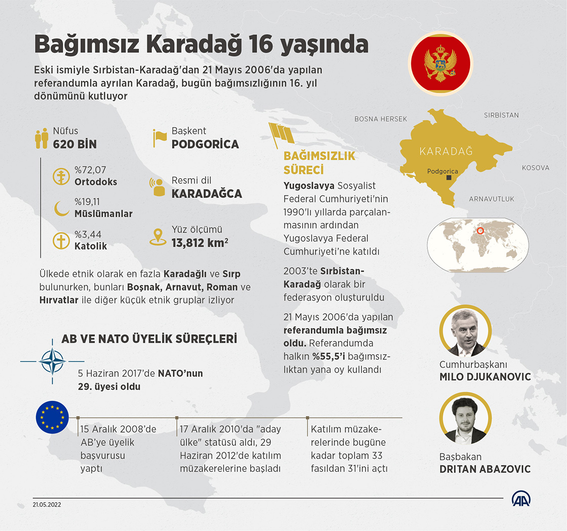 Eski ismiyle Sırbistan-Karadağ'dan 21 Mayıs 2006'da yapılan referandumla ayrılan Karadağ, bugün bağımsızlığının 16. yıl dönümünü kutluyor. (Grafik: Yılmaz Yücel/AA)