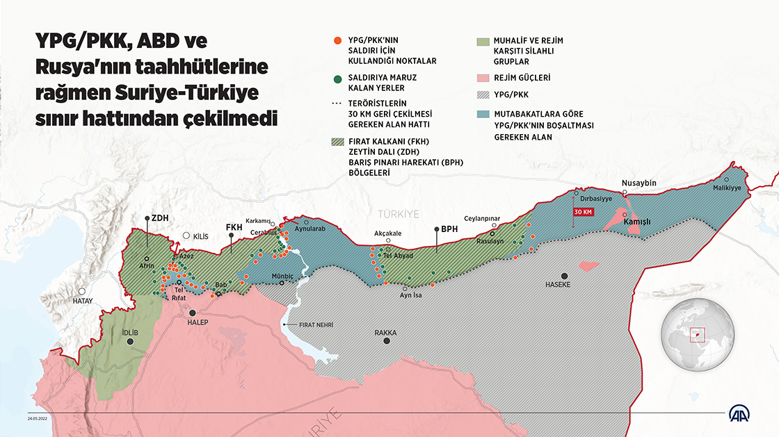 YPG/PKK'lı teröristler, çekilmesi gereken bölgelerden, ülkenin kuzeyindeki Azez, Bab, Cerablus, Afrin, Tel Abyad ve Rasulayn ilçelerini sık sık ağır silahlarla hedef alıyor. (Grafik: Mahmut Resul Karaca/AA)24 Mayıs 2022•Güncelleme: 24 Mayıs 2022