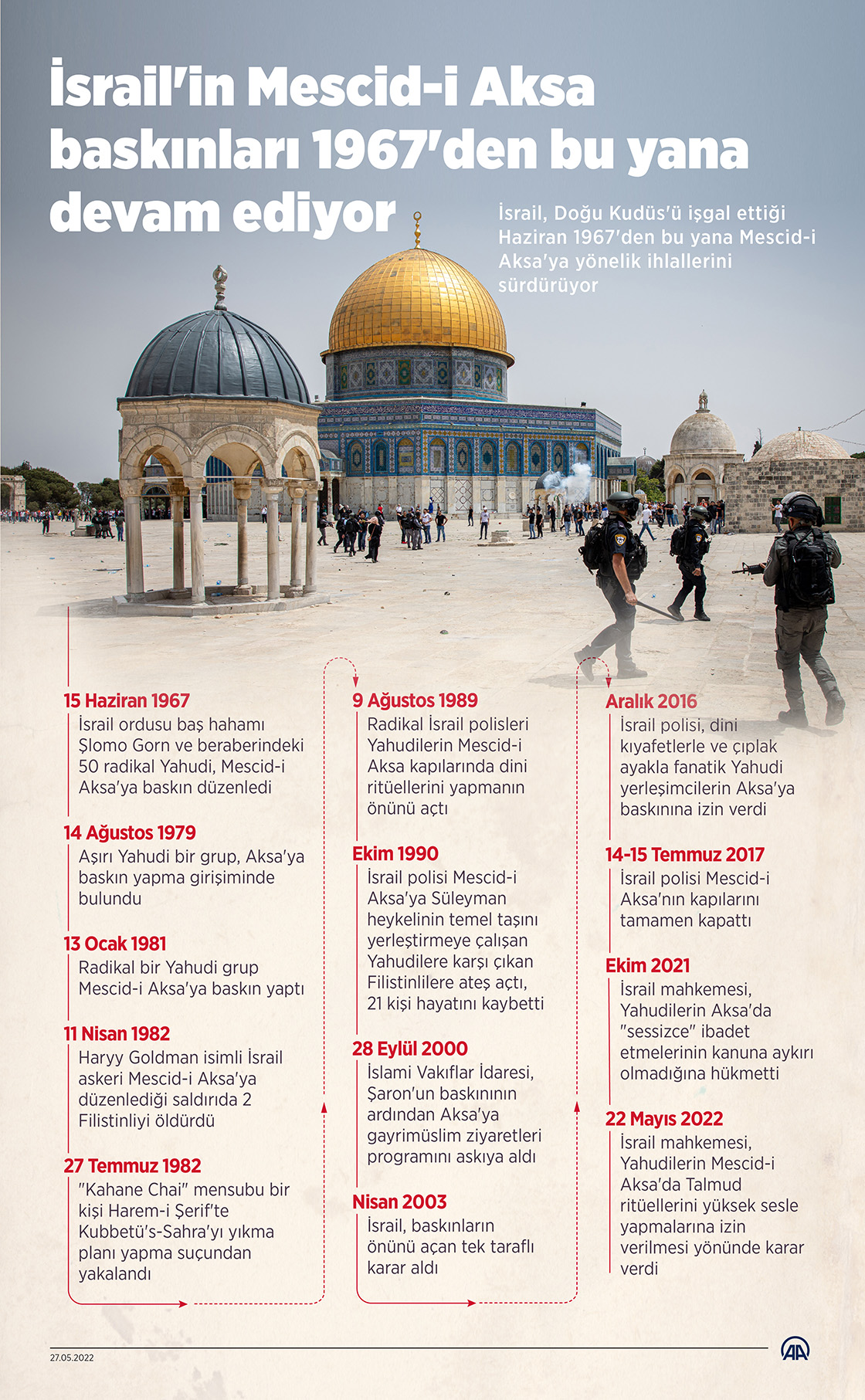 İsrail, Doğu Kudüs'ü işgal ettiği Haziran 1967'den bu yana Mescid-i Aksa'ya yönelik ihlallerini sürdürüyor. (Grafik: Omar Zaghloul/AA)