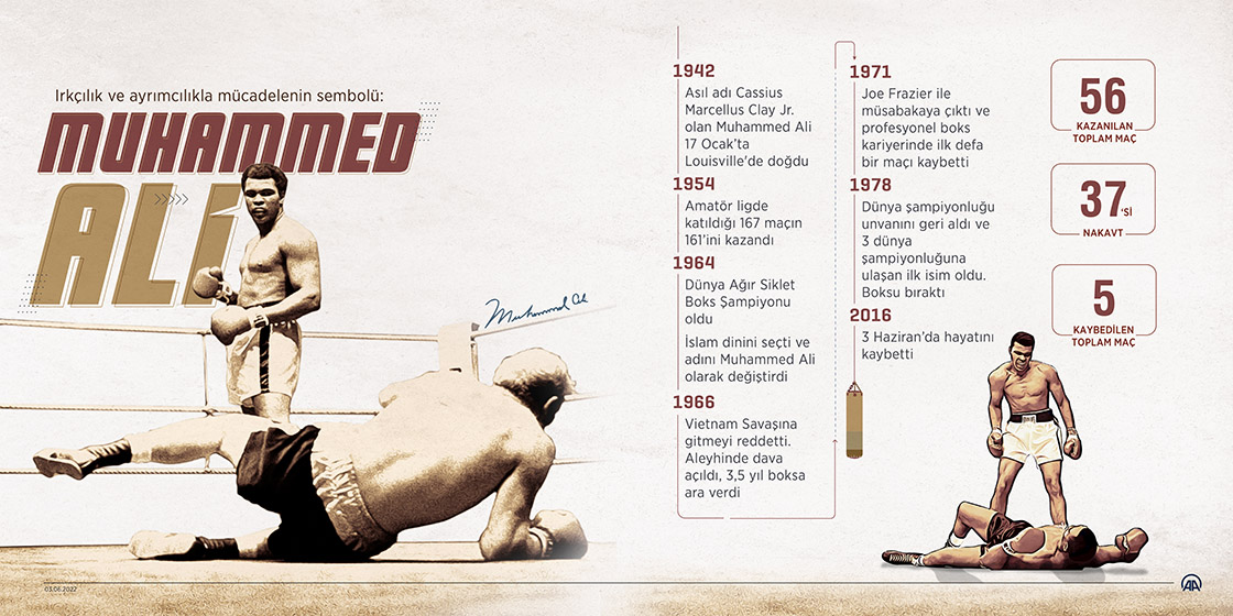 Spor dünyasında "tüm zamanların en büyüğü" olarak anılan, ömrünü ırkçılık ile ayrımcılıkla mücadeleye adayan efsanevi boksör ve Müslüman aktivist Muhammed Ali vefatının 6. yılında anılıyor. (Grafik: Omar Zaghloul/AA)