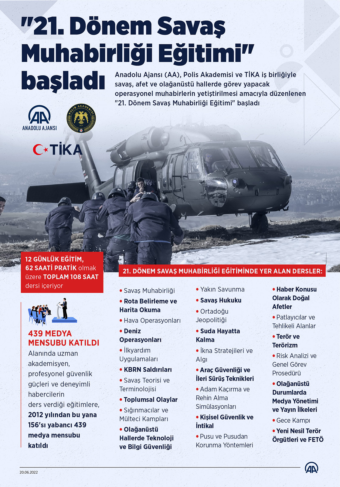 Anadolu Ajansı (AA), Polis Akademisi ve TİKA iş birliğiyle savaş, afet ve olağanüstü hallerde görev yapacak operasyonel muhabirlerin yetiştirilmesi amacıyla düzenlenen "21. Dönem Savaş Muhabirliği Eğitimi" başladı.