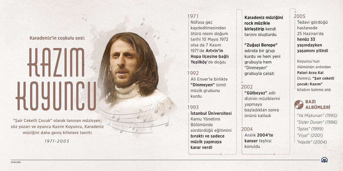 "Şair Ceketli Çocuk" olarak tanınan, müzisyen, söz yazarı, oyuncu ve aktivist Kazım Koyuncu, ölümünün 17'inci yılında anılıyor. (Grafik: Omar Zaghloul/AA)