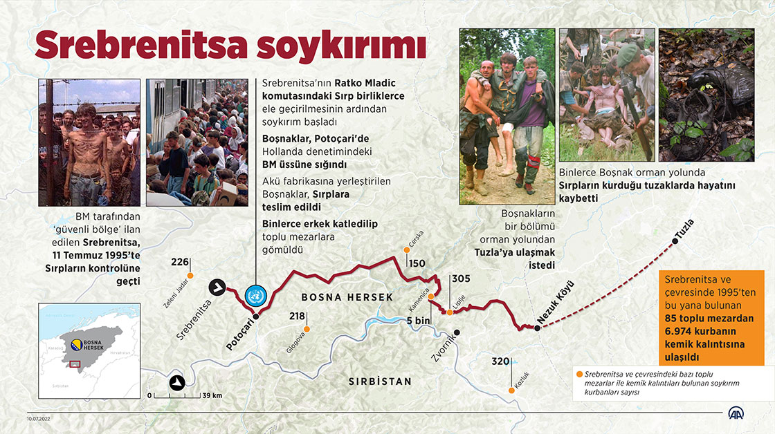 Bosna Hersek'in doğusundaki Srebrenitsa'nın 11 Temmuz 1995'te Ratko Mladic komutasındaki Sırp birliklerce ele geçirilmesinin ardından başlayan ve kısa zaman içinde 8 binden fazla Boşnak sivilin hunharca öldürüldüğü soykırım, Boşnak halkının kanayan yarası olmayı sürdürüyor. (Grafik: Kemal Delikmen/AA)10 Temmuz 2022•Güncelleme: 10 Temmuz 2022