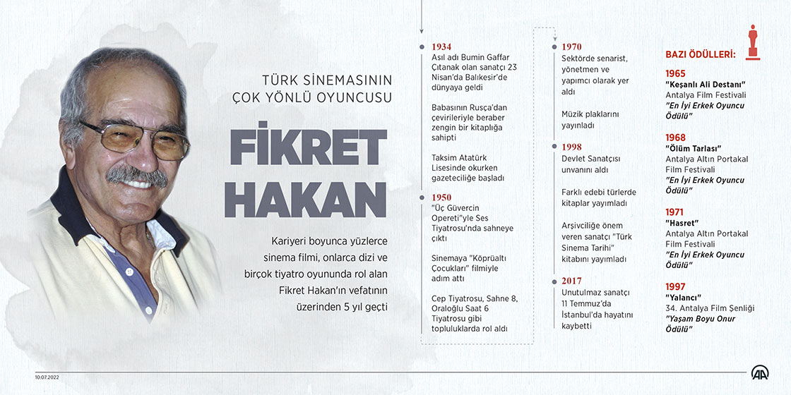 Kariyeri boyunca yüzlerce sinema filmi, onlarca dizi ve birçok tiyatro oyununda rol alan Fikret Hakan'ın vefatının üzerinden 5 yıl geçti. (Grafik: Kemal Delikmen/AA)