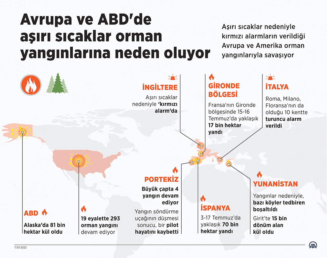 Aşırı sıcaklar nedeniyle kırmızı alarmların verildiği Avrupa ve Amerika orman yangınlarıyla savaşıyor. (Grafik: Omar Zaghloul/AA)