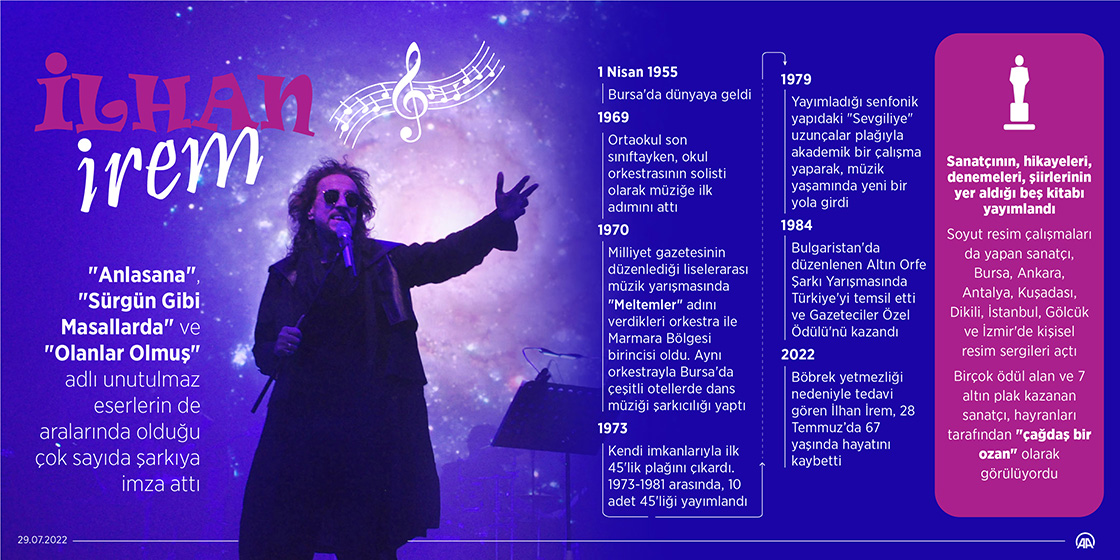"Anlasana", "Sürgün Gibi Masallarda" ve "Olanlar Olmuş" adlı unutulmaz eserlerin de aralarında olduğu çok sayıda şarkıya imza atan müzisyen ve şarkı sözü yazarı İlhan İrem, 67 yaşında hayatını kaybetti. (Grafik: Mevlüt Eren/AA)