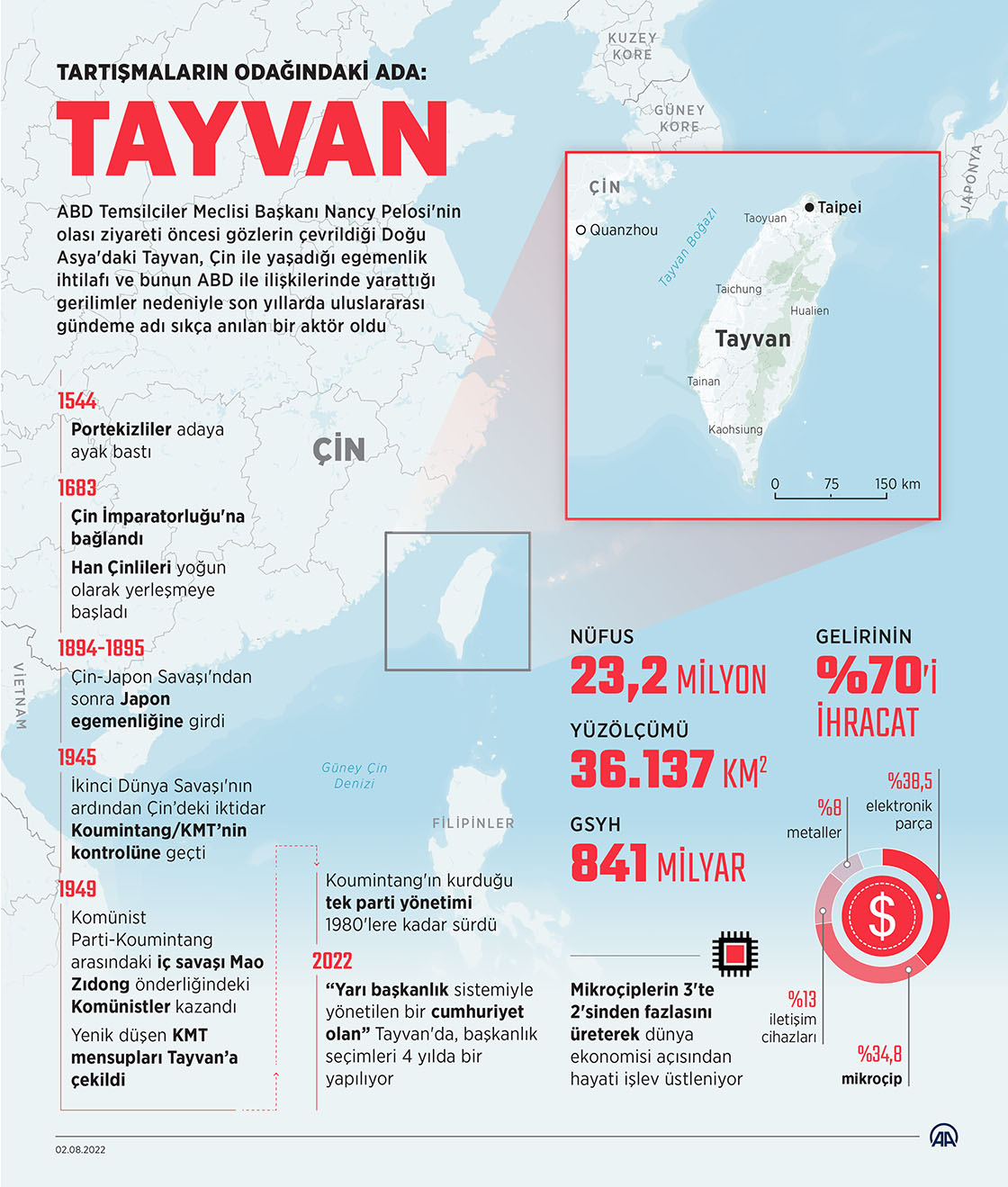 ABD Temsilciler Meclisi Başkanı Nancy Pelosi'nin olası ziyareti öncesi gözlerin çevrildiği Doğu Asya'daki Tayvan, Çin ile yaşadığı egemenlik ihtilafı ve bunun ABD ile ilişkilerinde yarattığı gerilimler nedeniyle son yıllarda uluslararası gündeme adı sıkça anılan bir aktör oldu. (Grafik: Elmurod Usubaliev/AA)