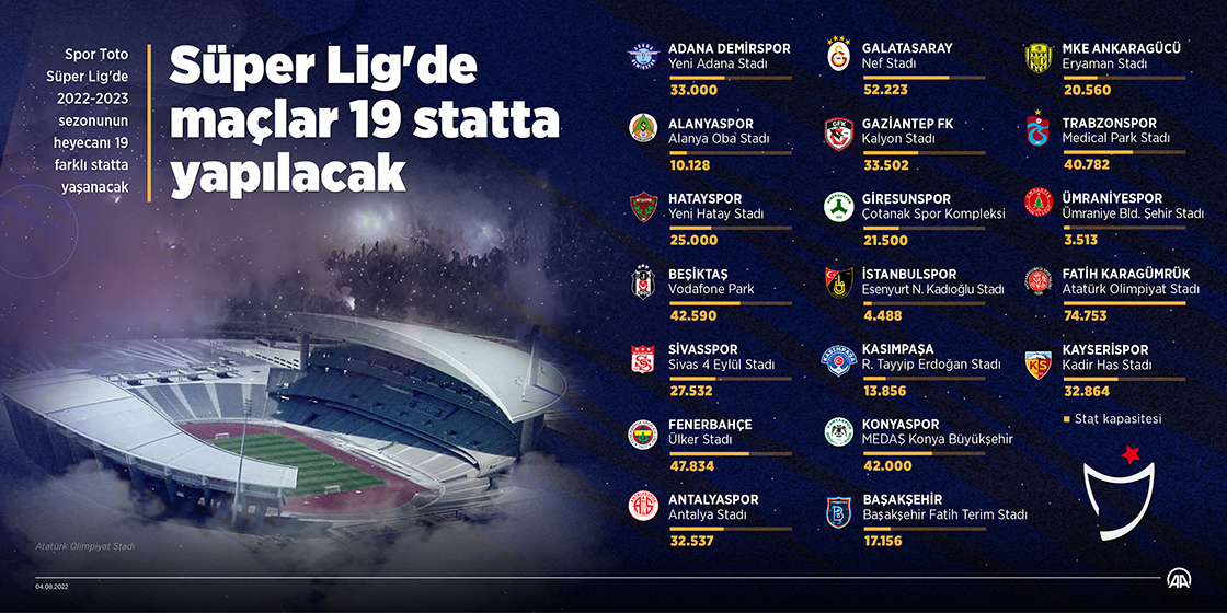 Türk futbolunun en üst seviye organizasyonu olan Süper Lig'de 65. sezonun heyecanı 19 farklı statta yaşanacak. (Grafik: Muhammed Ali Yiğit/AA)
