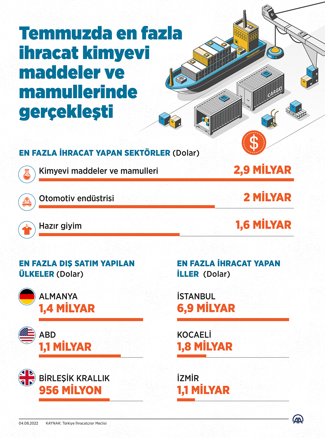 Kimyevi maddeler ve mamulleri, geçen ay 2,9 milyar dolarla en fazla ihracat gerçekleştiren sektör oldu. (Grafik: Elmurod Usubaliev/AA)