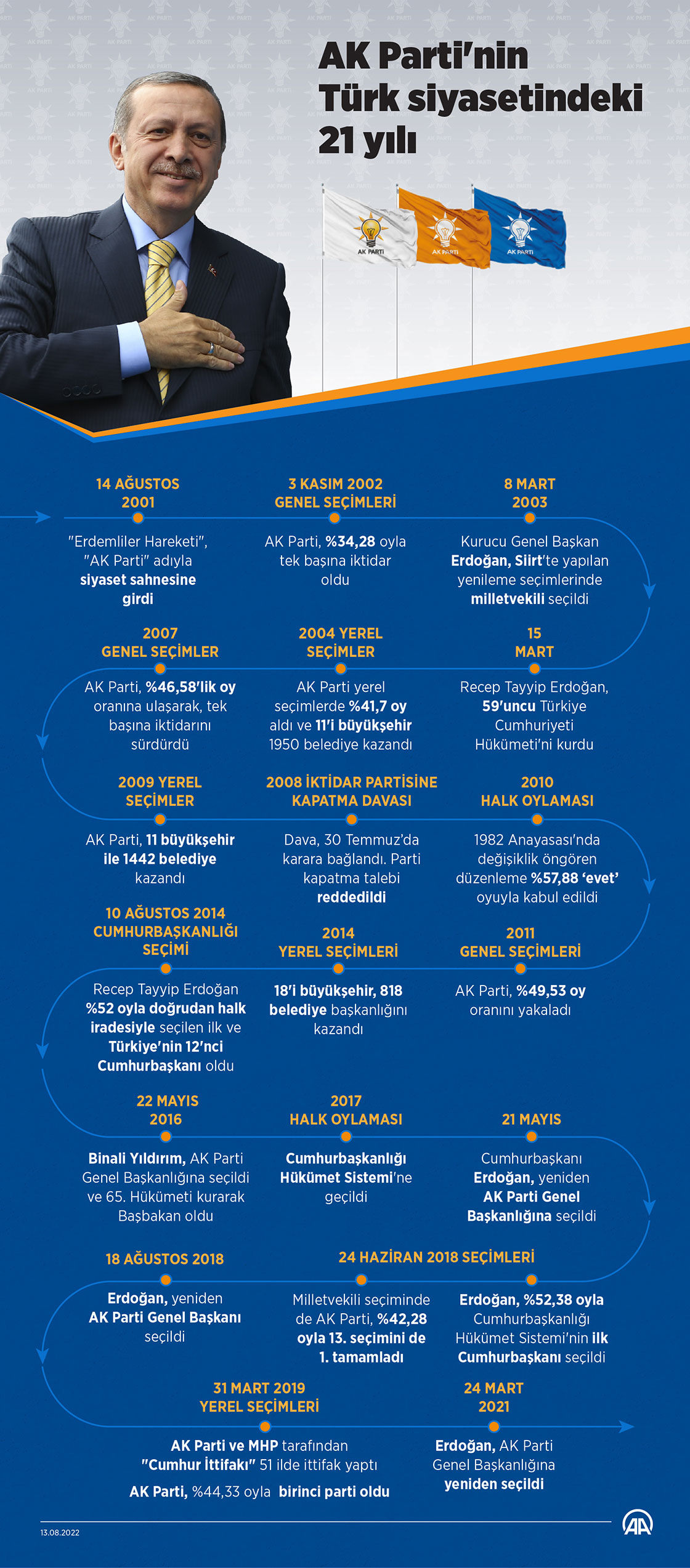 Recep Tayyip Erdoğan liderliğinde, Türkiye'nin 39. partisi olarak Türk siyasetine giren AK Parti, çeşitli engellemelere rağmen yaptığı reformlarla ve girdiği tüm seçimlerden birinci parti olarak çıkmayı başardı. (Grafik: Elmurod Usubaliev/AA)