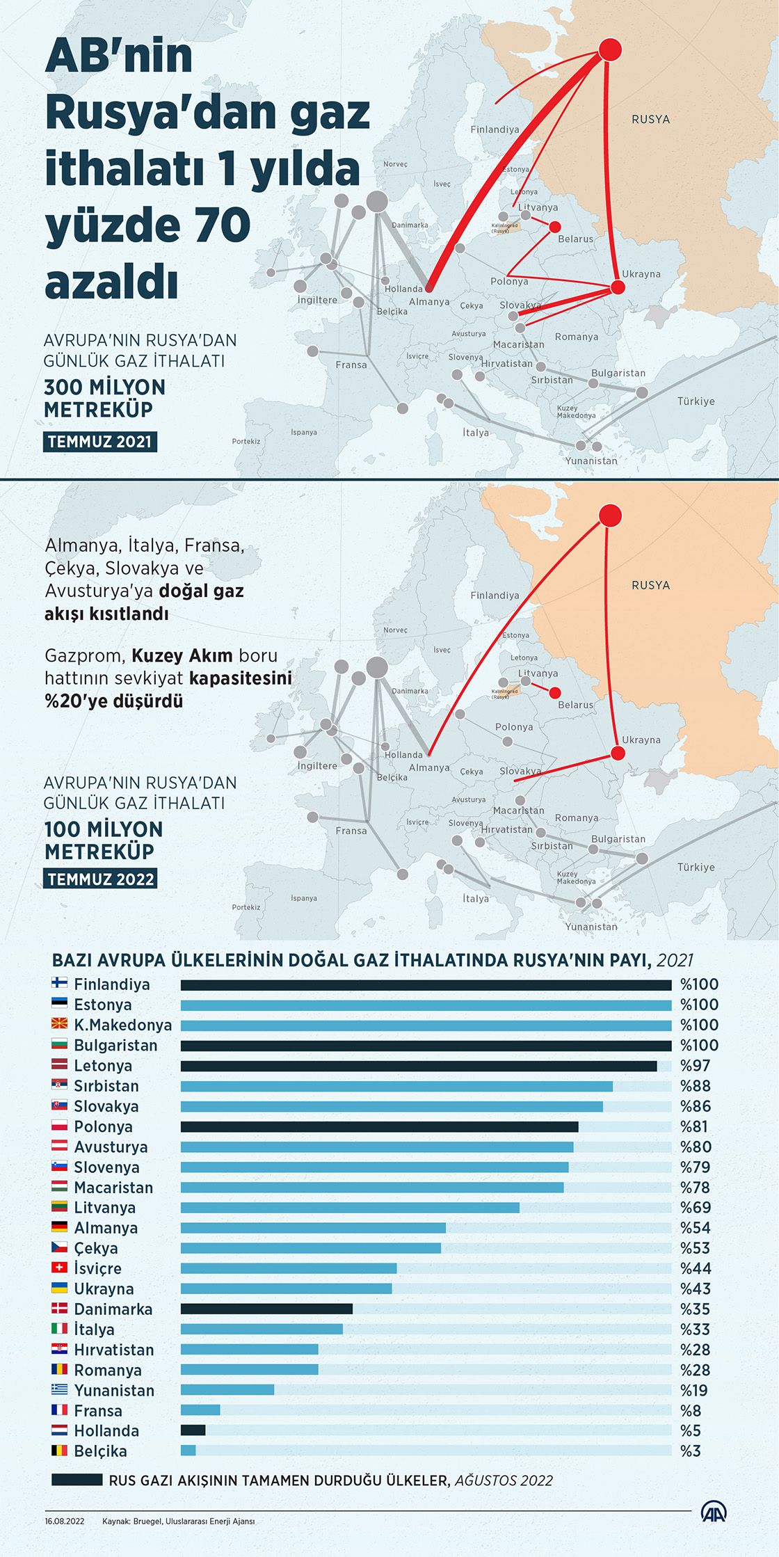 Avrupa Birliği'nin (AB) Rusya'dan ithal ettiği doğal gaz miktarı temmuzda geçen yılın aynı ayına göre yaklaşık yüzde 70 azalarak günlük 100 milyon metreküpün altına indi. (Grafik: Mahmut Resul Karaca/AA)
