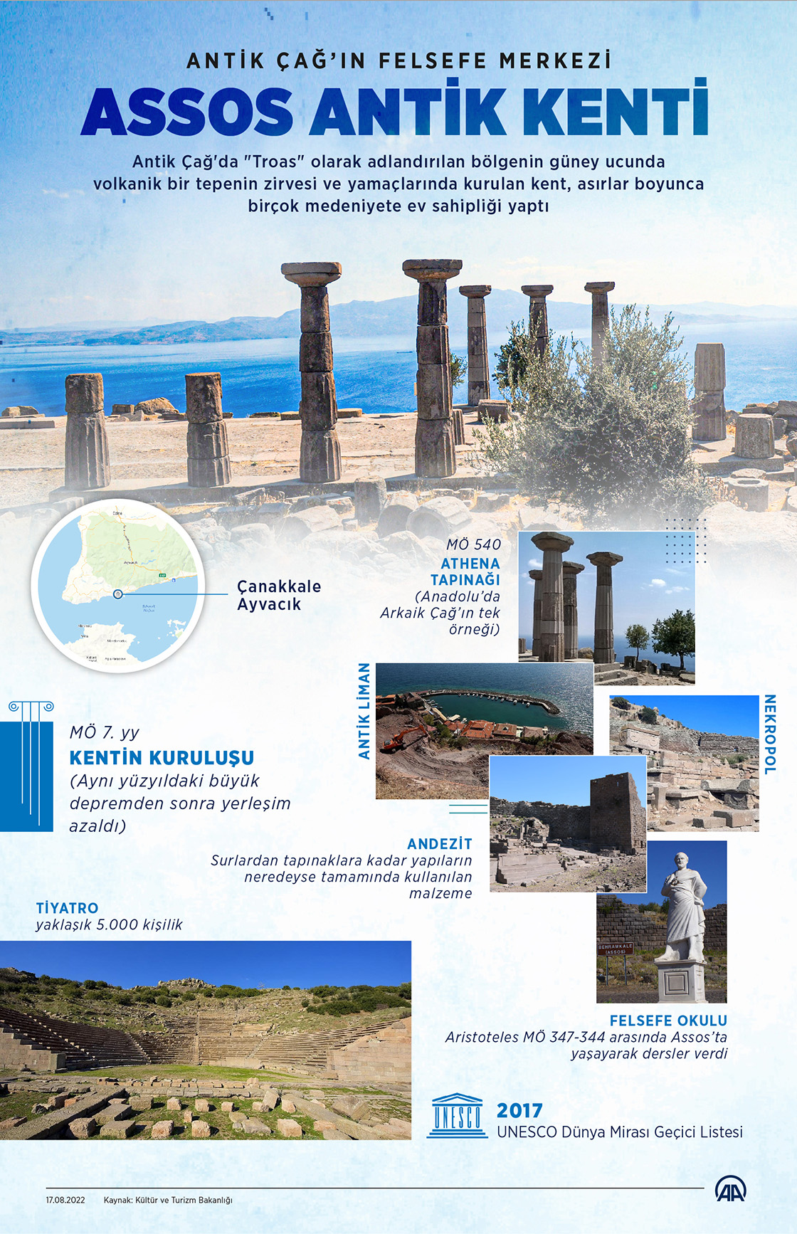 Antik Çağ'da "Troas" olarak adlandırılan bölgenin güney ucunda volkanik bir tepenin zirvesi ve yamaçlarında kurulan kent, asırlar boyunca birçok medeniyete ev sahipliği yaptı. (Grafik: Muhammed Ali Yiğit/AA)