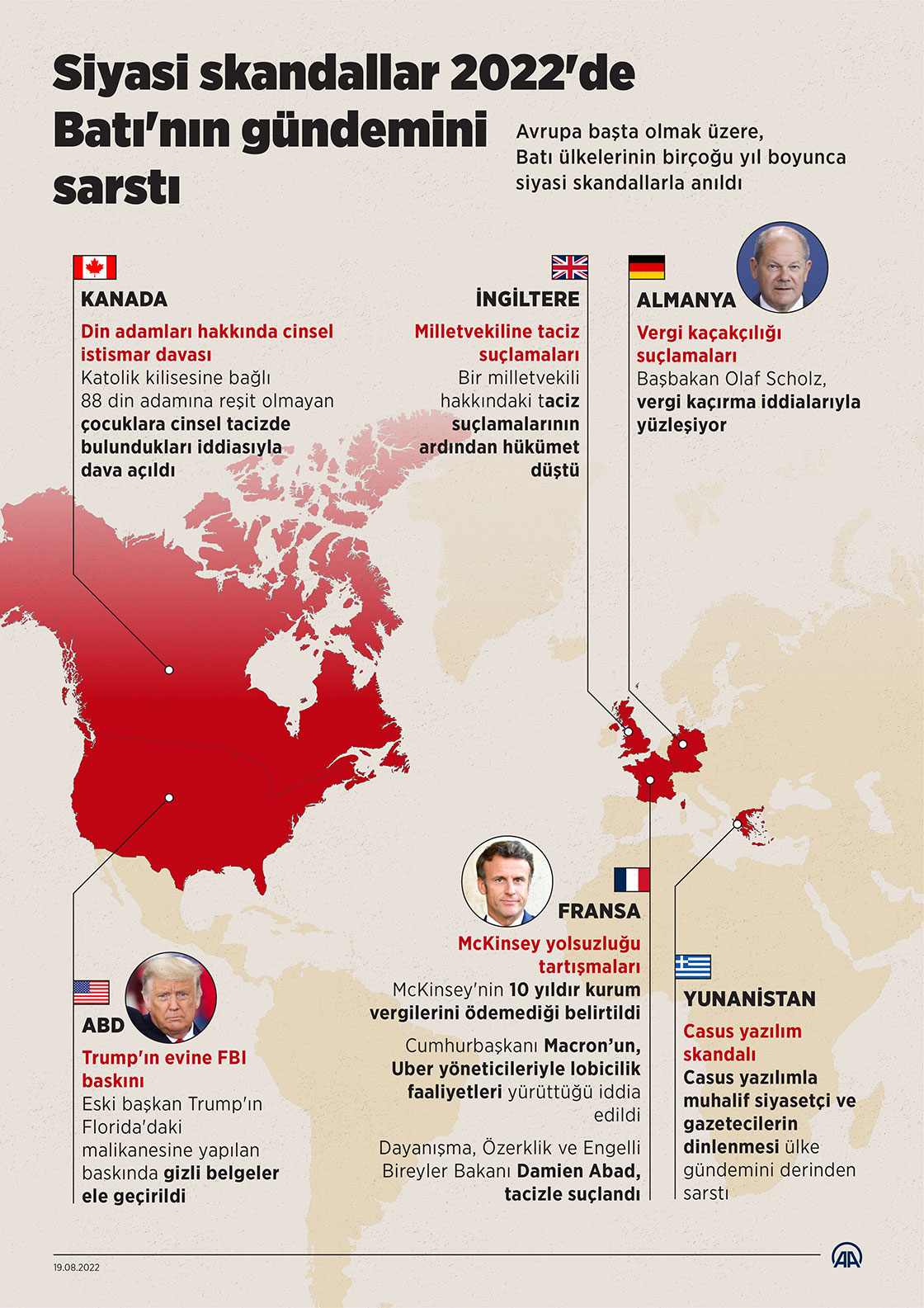 Avrupa başta olmak üzere, Batı ülkelerinin birçoğu yıl boyunca siyasi skandallarla anıldı. (Grafik: Yasin Demirci/AA)